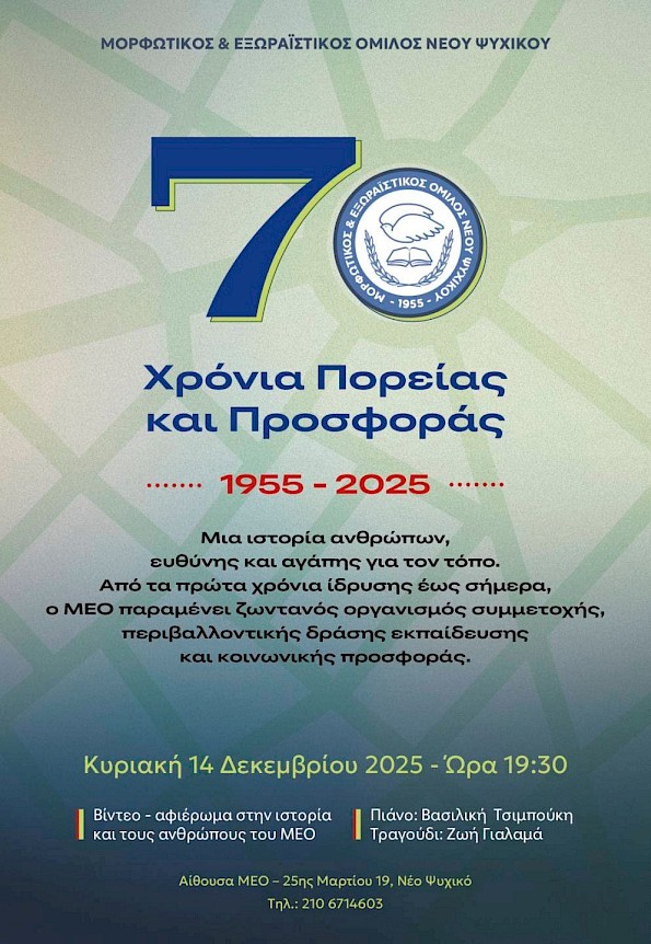 Ο Μορφωτικός και Εξωραϊστικός Όμιλος Νέου Ψυχικού γιορτάζει φέτος 70 χρόνια πορείας, προσφοράς και δράσης (1955–2025). Από την ίδρυσή του έως σήμερα, ο ΜΕΟ παραμένει ένας ζωντανός οργανισμός συμμετοχής, περιβαλλοντικής δράσης, εκπαίδευσης και κοινωνικής προσφοράς, με ανθρώπους που υπηρετούν με ευθύνη και αγάπη τον τόπο.